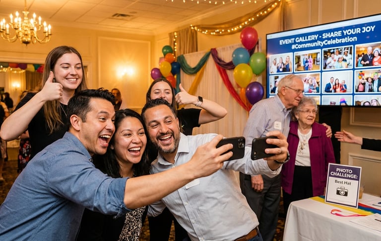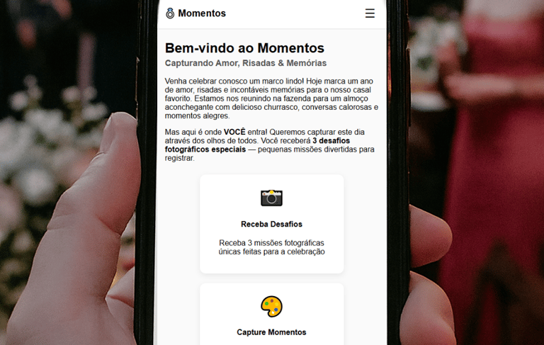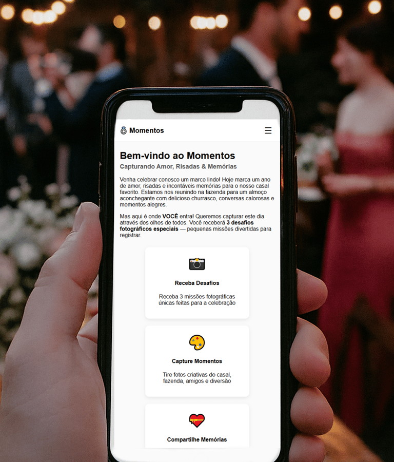 A Galeria de Fotos com Desafios é uma solução digital criativa que estimula os convidados a participarem ativamente do evento, registrando momentos marcantes a partir de missões fotográficas.
